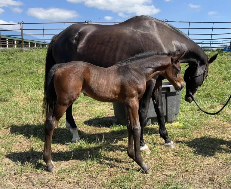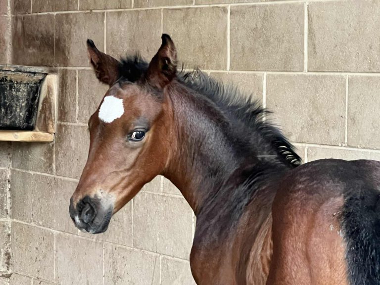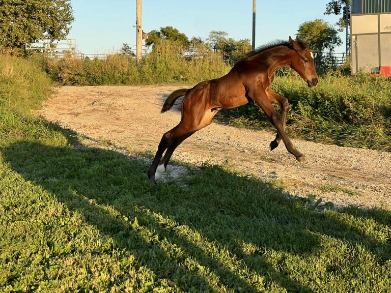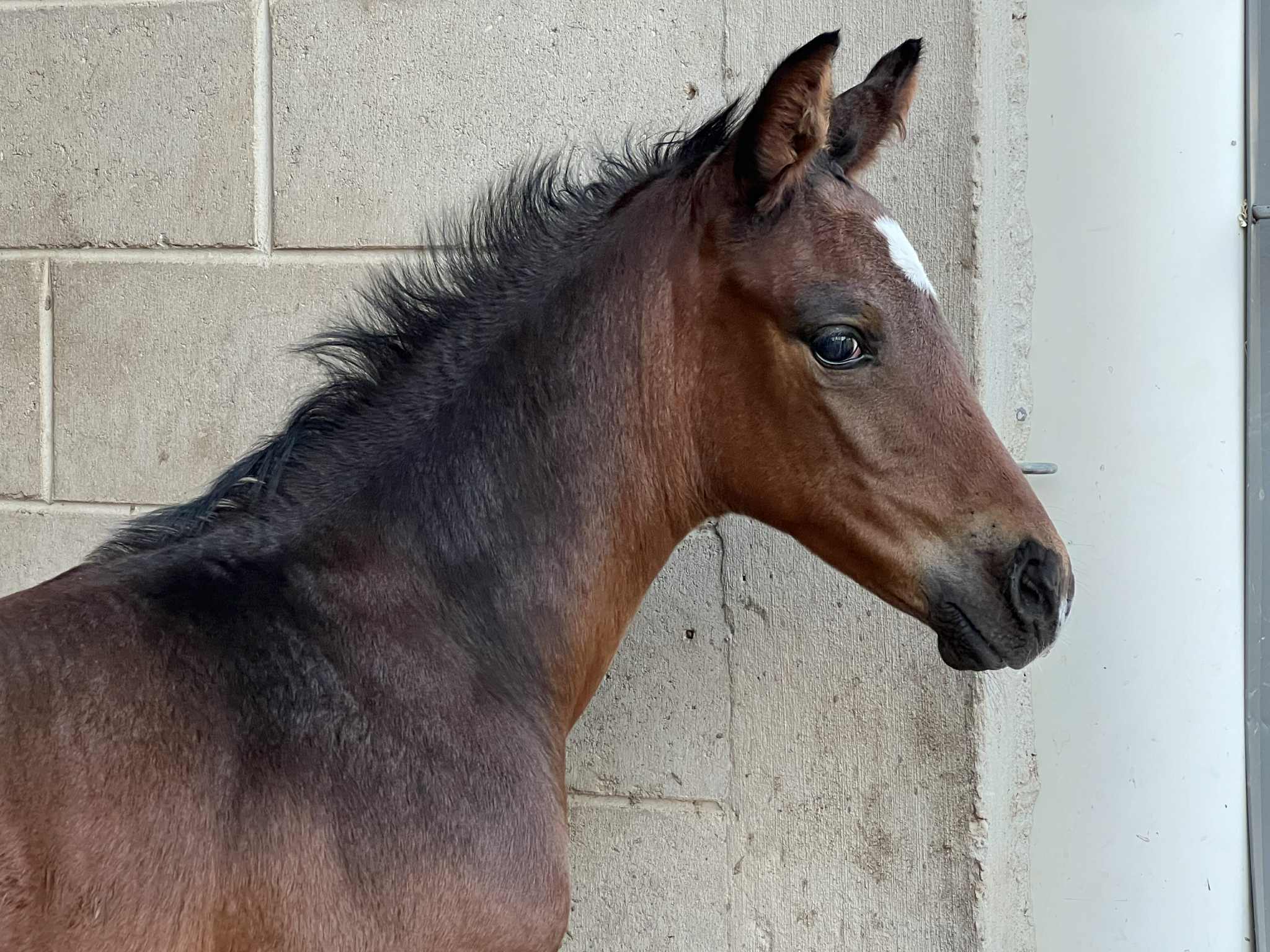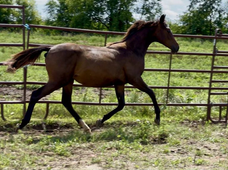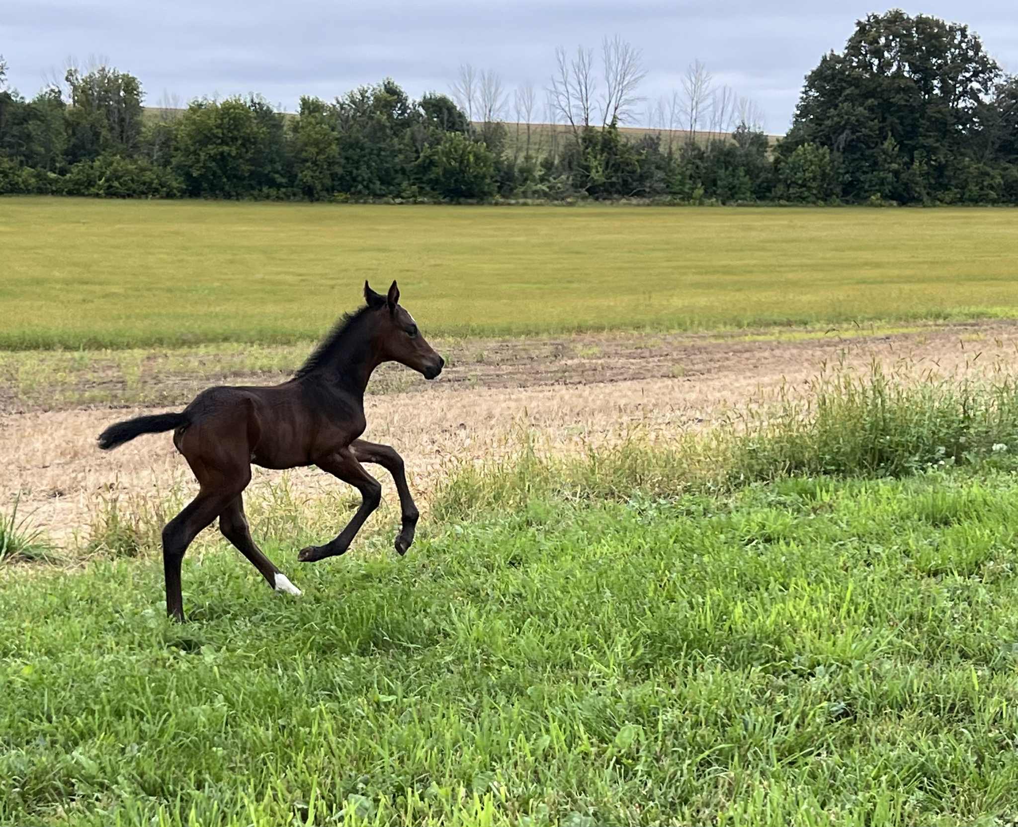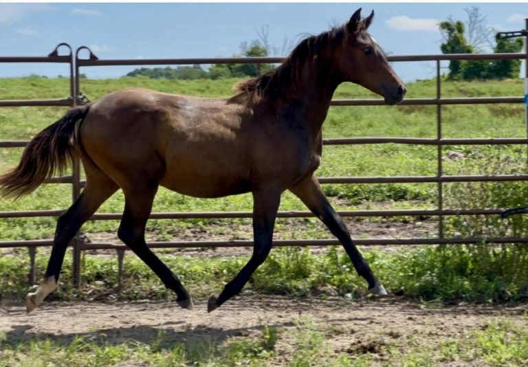 2024 bay Russian Warmblood filly. Her mother is one of the few rare Budyonny mares in the USA. This filly is exceptionally sweet and people oriented. She is growing up in a big pasture with other horses who all like her. She is expected to mature to 15.3-16h